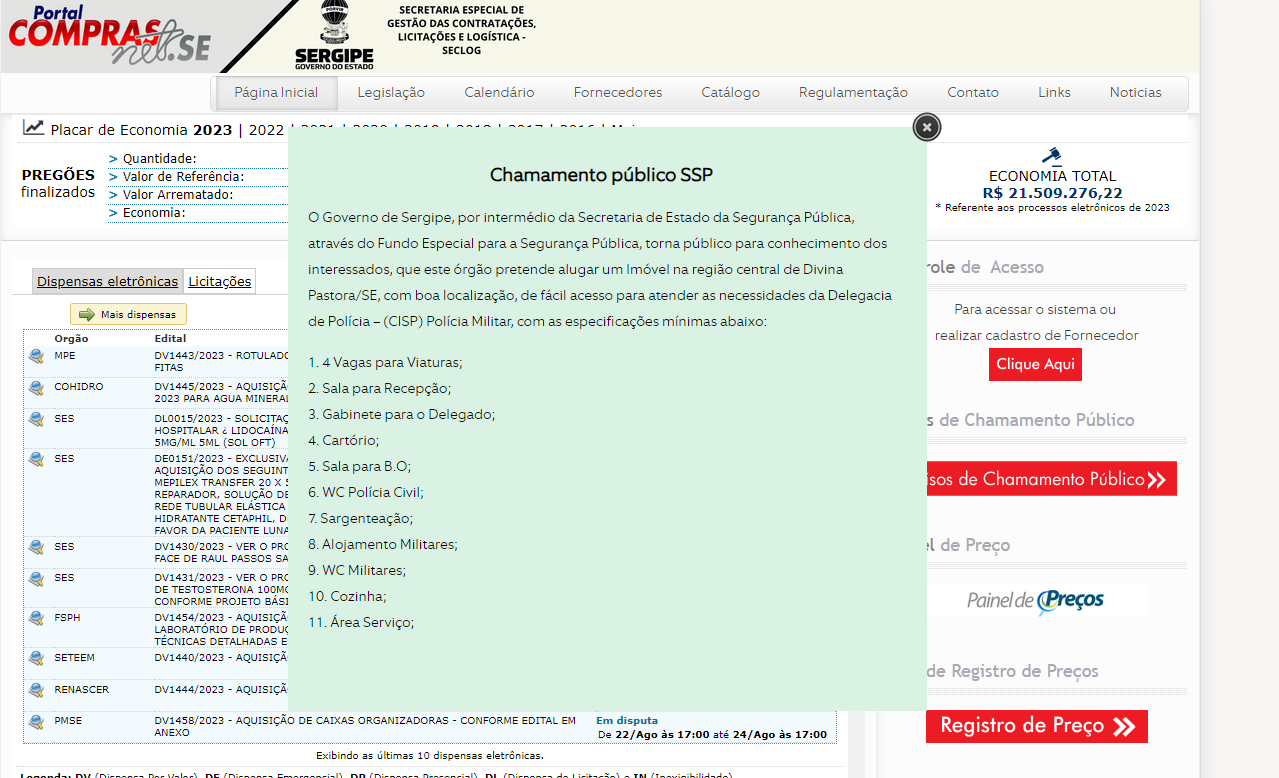O Governo de Sergipe, por intermédio da Secretaria de Estado da Segurança Pública, através do Fundo Especial para a Segurança Pública, torna público para conhecimento dos interessados, que este órgão pretende alugar um Imóvel na região central de Divina Pastora/SE, com boa localização, de fácil acesso para atender as necessidades da Delegacia de Polícia – (CISP) Polícia Militar, com as especificações mínimas abaixo: