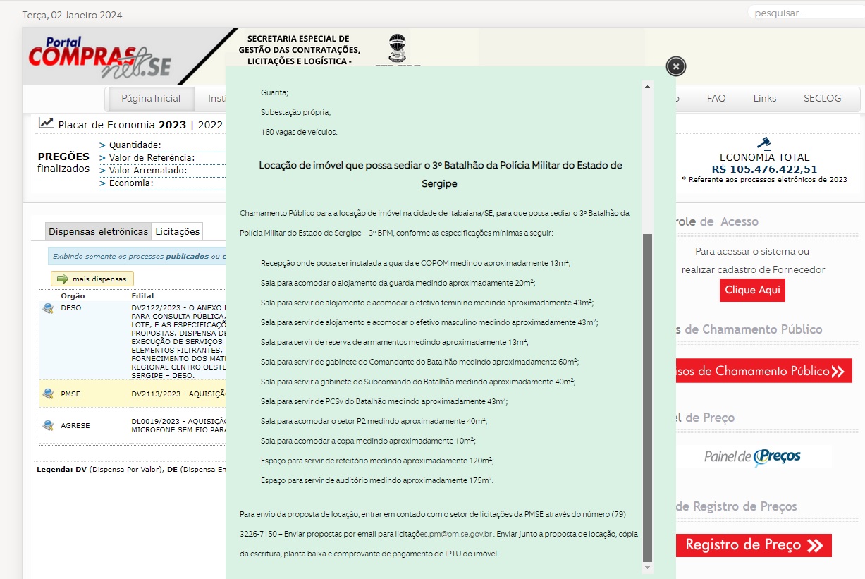 Locação de imóvel que possa sediar o 3º Batalhão da Polícia Militar do Estado de Sergipe