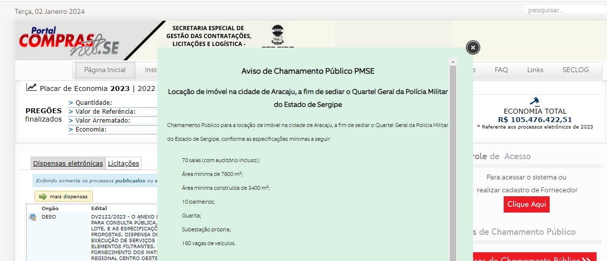 Chamamento Público para a locação de imóvel na cidade de Aracaju, a fim de sediar o Quartel Geral da Polícia Militar do Estado de Sergipe, conforme as especificações mínimas a seguir: