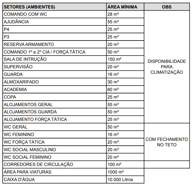 Chamamento público para acolhimento de propostas destinadas à locação de imóvel na cidade de Nossa Senhora do Socorro - SE, na área do Complexo Palestina, preferencialmente no Bairro Parque dos Faróis ou Bairro Jardim, a fim de sediar o 17º Batalhão de Polícia Militar, da Polícia Militar do Estado de Sergipe, conforme a descrição dos setores e as especificações mínimas a seguir:
